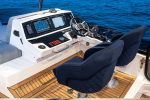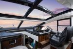 Inside, the dynamic feel continues with the Predator range of interior fabrics and textures throughout. Independent helm seats in the focussed cockpit allow owners to enjoy its piercing performance in comfort whilst underway. A carbon fibre opening roof with multiple glazed panels along with carefully devised concealed lighting, frames the saloon and maximises light throughout.