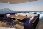 Unique on a yacht of her size is the I-Bridge Multitouch navigation system by Team Italia. All the onboard systems, including the hybrid propulsion, can be managed using the high-res 4K touch screens, trackball and jogger. The monitors can be raised to different heights in cockpit or navigation mode, and include an augmented reality function that overlaps navigation data with video images.