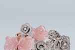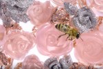 A hand-sculpted amethyst rose reveals a glimpse of diamond peeking out from under its petals, set like a dewdrop on a gold stem. Others, in rose quartz, act as a source of nectar for a foraging diamond-set bee. Elsewhere, a fine golden stem wraps around the fingers, and a bouquet of roses is completely diamond-drenched.