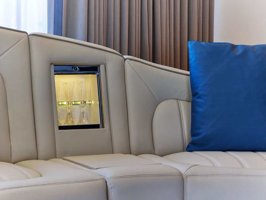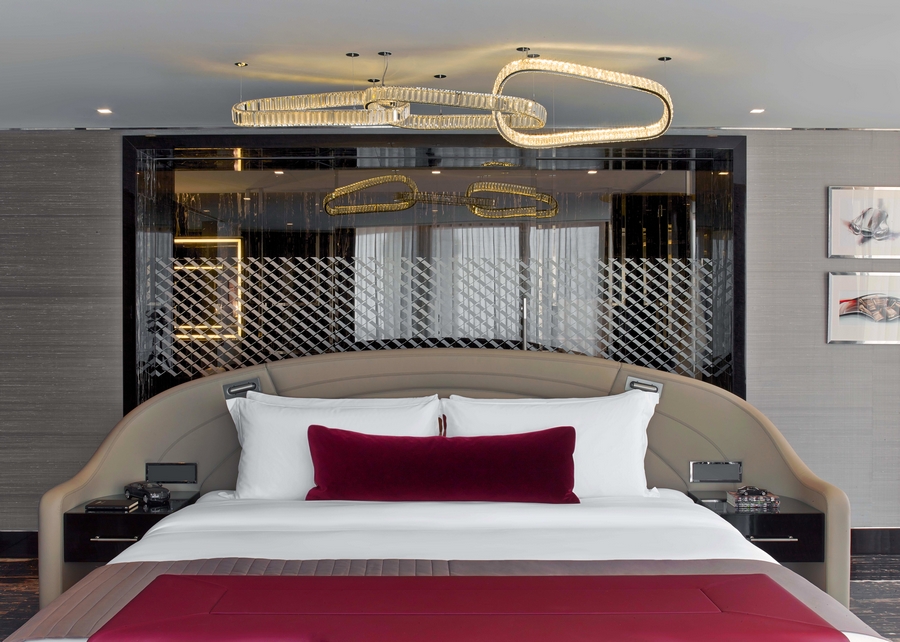 The living room features a bespoke built-in sofa crafted from Bentley leather, which brings Bentley’s unique motoring luxury indoors. The sofa, equipped with two champagne bottle coolers, features signature Bentley diamond upholstery with curved lines that echo the architecture of the suite. Overhanging the scene, a captivating light installation based on the Continental’s jewelled headlights and the sinuous curves of the Nürburgring Racetrack completes the room.