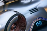 The show car’s body structure is made of carbon fibre. The multiple layers of paintwork in alubeam silver appear like liquid metal over the top. Functional attachment parts made of carbon fibre such as the front splitter epitomise the cool and rational aspect of this philosophy. The same applies to the front trim designed as a display, as well as the continuous lighting strip at the front. The side skirts also feature a lighting strip and the large, recessed EQ lettering in front of the rear wheels is illuminated blue.