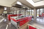 The hood, of significant sizes, is made of satin-finished nickel and offers extremely professional performances. The third island, which shows a top characterized by one single plate of steel longer than 4 meters, is meant for preparation and includes a meat slicer, a blast chiller, a vacuum packing device and a 1.10meter sink in addition to a refrigerator and a freezer. The wall-mounted washing area consists of two small glass cases, a professional washing machine, and an additional washbasin.