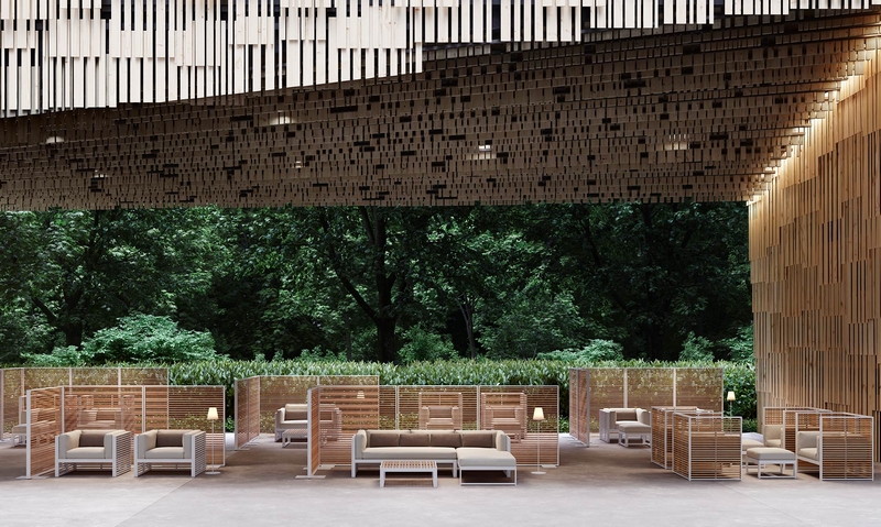 Discover the world’s most prestigious gatherings & exhibitionsOn this occasion, GANDIABLASCO presents a succession of Modules 1 measuring 360 cm. These elements of the series PERGOLAS house the cosy relaxing areas of BOSC, and serve as a transition between the architecture present inside the place and the environment in the open air, since they merge with the landscape. This contemporary reinterpretation of the traditional wooden pergolas is built with black thermo-lacquered aluminium profiles and enclosures and ceilings based on fixed horizontal slats in the innovative roble golden faux wood aluminium finish. The Wind curtains in mineral colour allow to increase the level of privacy according to the needs.