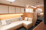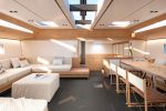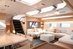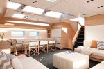 The story continues below. With the engine room tucked away below the saloon, the stage is set for a huge open-plan space that combines dining, lounging and even working in style. A single skylight runs the full length of the low-profile coachroof, while hatches and hull windows all combine to turn this into a sun-soaked living area.