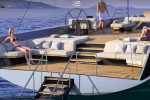 And there’s even a huge tender compartment hidden beneath this deck, capable of harbouring a boat up to 4m long. This keeps the transom clear for swimmers, where a hydraulic bathing ladder can completely retract into the hull.