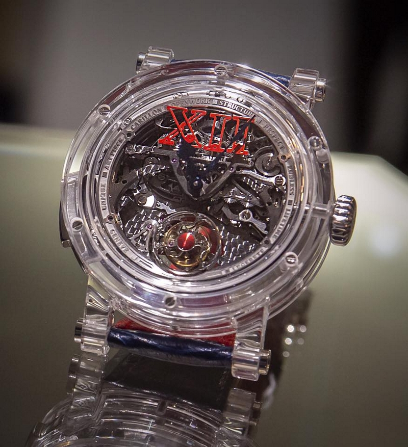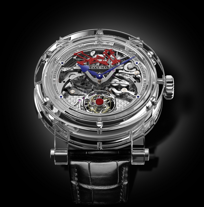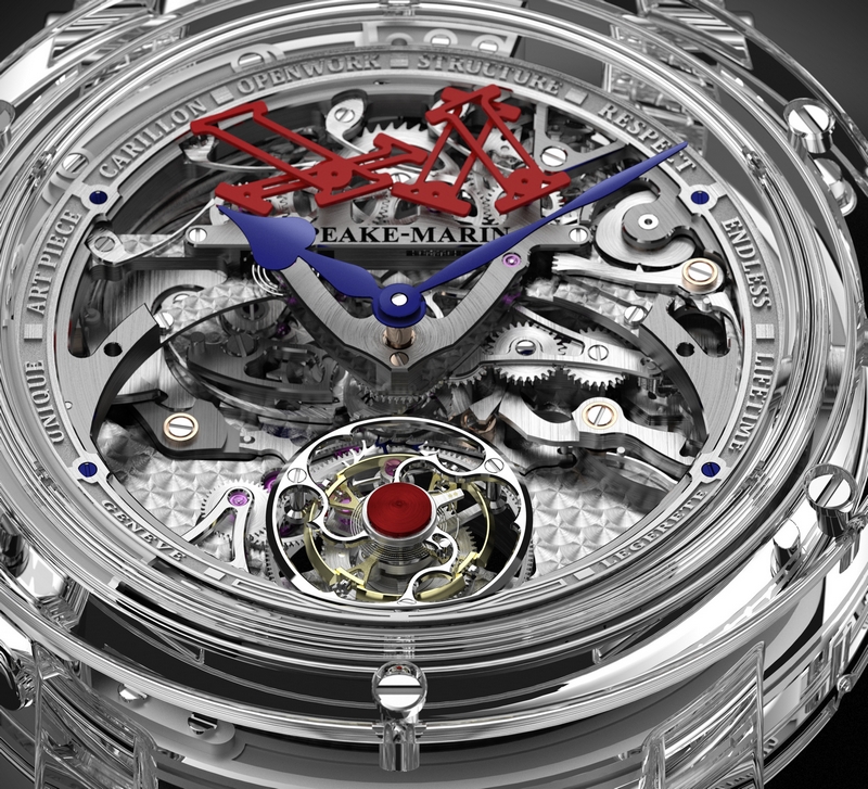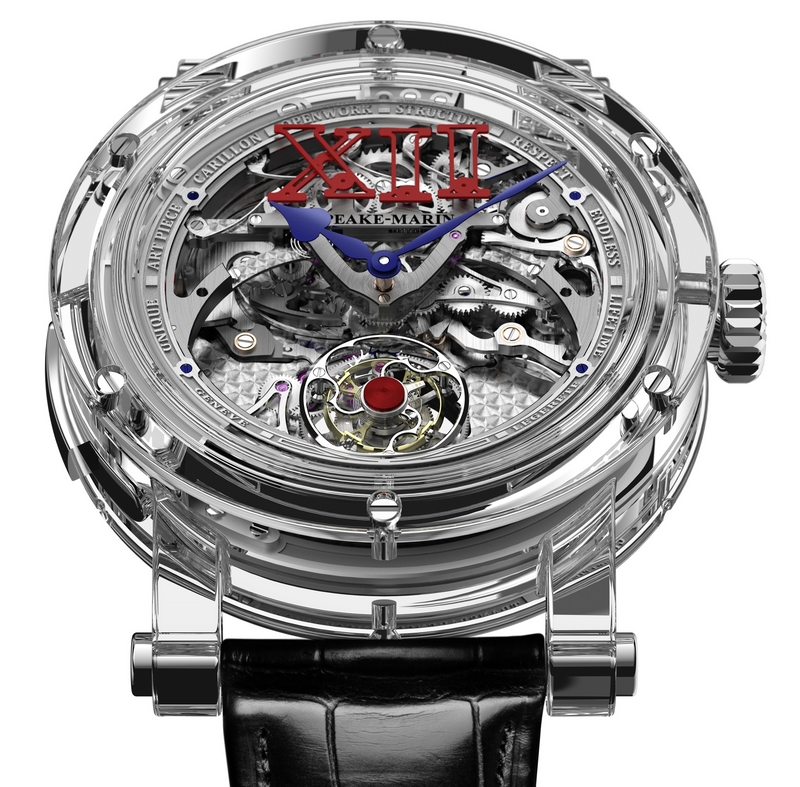 Minute Repeater Flying Tourbillon Légèreté by Speake-Marin, the watchmaking company specializing in high-end timepieces: The first Minute Repeater Carillon ever in a 100% sapphire case.
