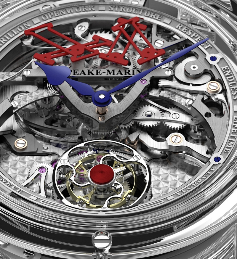 The new Speake-Marin Haute Horlogerie masterpiece is called “Légèreté”, which means “Lightness” in English, to highlight the sapphire-crystal case, which allows to literally dive into the movement from the top, the sides or the case back. The case is made up of three parts: the bezel, the case back and the middle section. The process by which the sapphire is made into a finished watch case is extraordinarily difficult, involving many hours of machining and polishing.