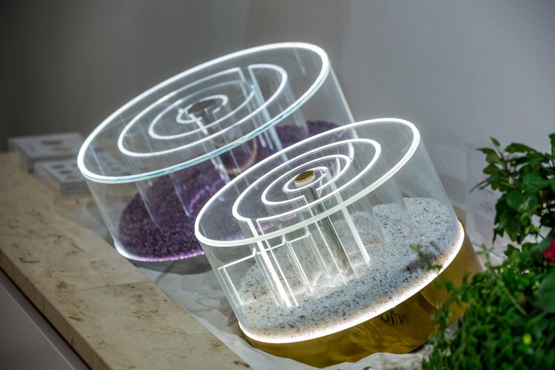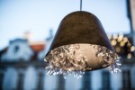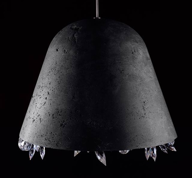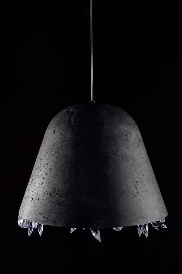 “I strove to achieve a similar effect using the combination of unrefined concrete and the precision of crystal chandelier trimmings. From a distance, the lampshade conceals a glittering treasure, which the viewer only uncovers as they come closer,” explained the artist.