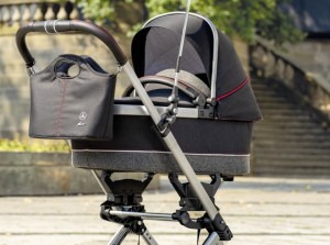 “DESSIN Sport” Infant Carrier Bed in black / a nthracite / silver with red stitching on the grip upholstery and safety belt with Undercarriage in iridium silver; Accessories: sunshade umbrella, handlebar bag and handbag.