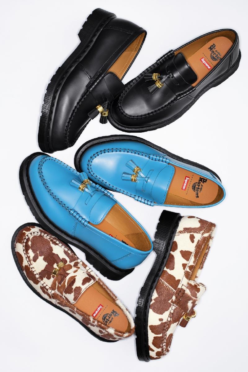 Supreme has worked with Dr. Martens on a new version of the Penton Tassel Loafer. The new shoe features hair-on-hide and smooth leather uppers with engraved logo metal tassel rings and AirWair cushion soles. Made exclusively for Supreme, the shoe will be offered in three color ways.