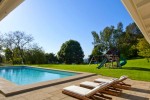 The property includes a separate two-bedroom, two-bathroom guest house with a full kitchen, as well as a separate two-bedroom, one-bathroom staff house with kitchen, and a pool area. The estate is among the few in Beverly Hills zoned for horses, and includes stables. The surrounding acres include a vegetable garden, extensive walking trails and private patios and sitting areas.