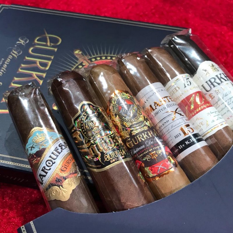 2018 International Premium Cigar & Pipe Retailers samplers featuring the Marquesa, Ghost Gold, Chateu de Prive, Blendmaster’s Cask, 10th Anniversary, and Heritage; photo: gurkha cigars