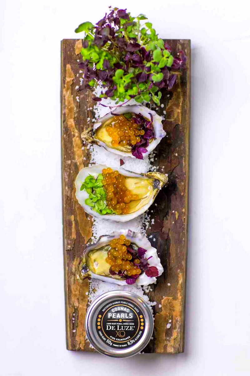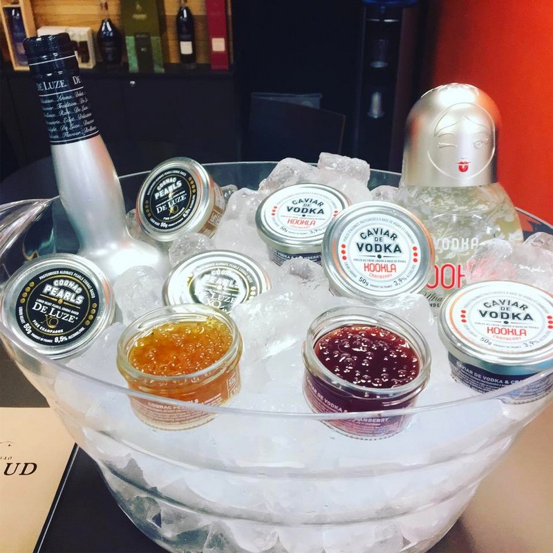 Cognac Pearls can be used in your cocktails but also as a topping on dishes (such as oysters,foie gras, desserts, chocolate, ice cream,…) combining decoration and tastiness. These pearls are made from Cognac De Luze XO Fine Champagne that has been reduced to 8.5% of alcohol and encapsulated in a thin layer made from natural algae.