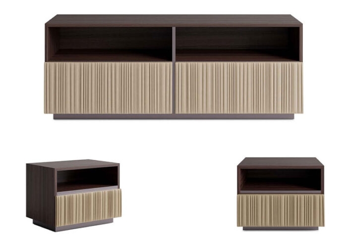 Inspired by Trussardi’s iconic Lovy Bag, the Deven line is enriched with a chest of drawers and night tables. Carlo Colombo reinterprets  the working technique applied to the bag in the vertical quilting in leather, playfully alternating between full and empty spaces, open compartments, drawers and doors with varying storage functions.