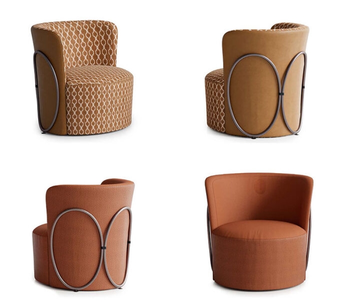 Designed by Carlo Colombo, the Oval family reflects the heart of the Trussardi Casa 2020 collection. The new Tru Damas fabric accentuates the iconicity of the armchair. The central element of the project is the metal oval, profile of the Trussardi logo: like an ancient medieval emblem, it recalls the iconic Italian spirit of the Milanese brand. Made of steel in the new dark matte bronze galvanic finish, it features dark chocolate Vermont leather details with Greyhound logo print.