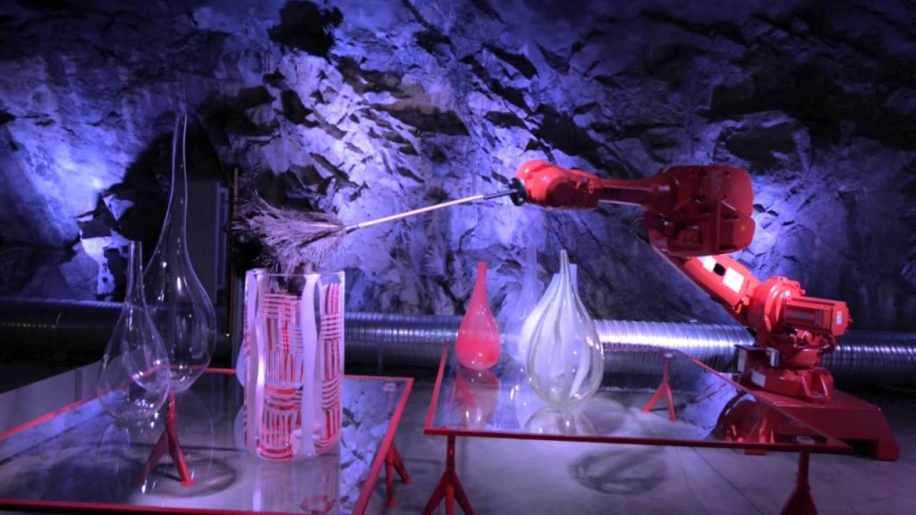 Heavy industrial robots in a landscape of glass: Glass Elephant signature exhibition at stockholm design week.