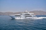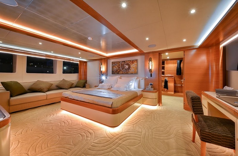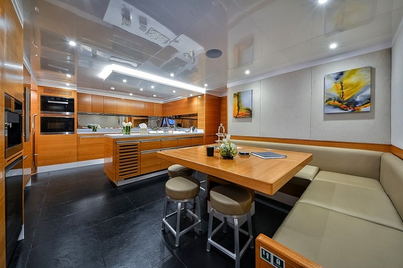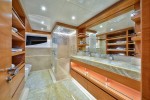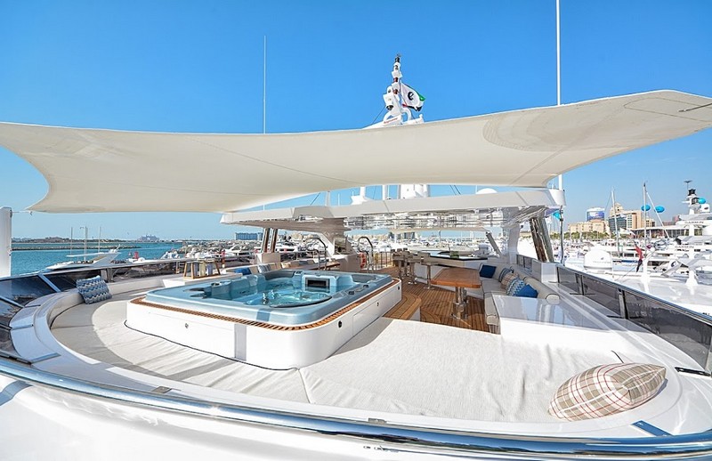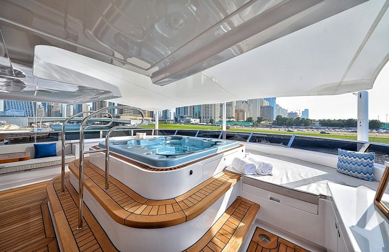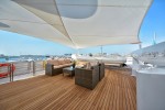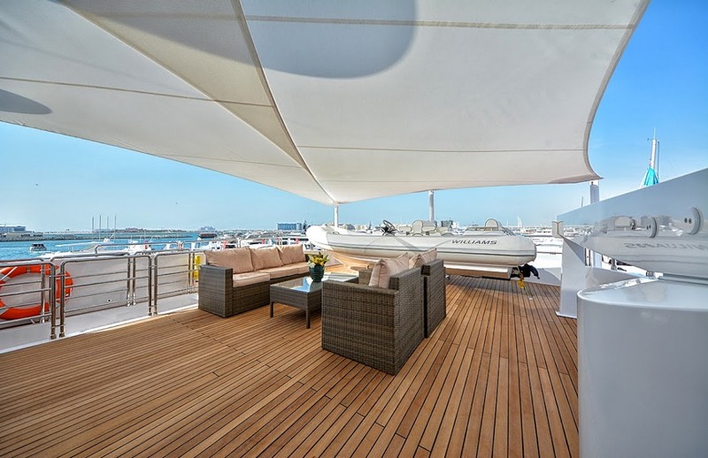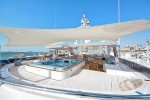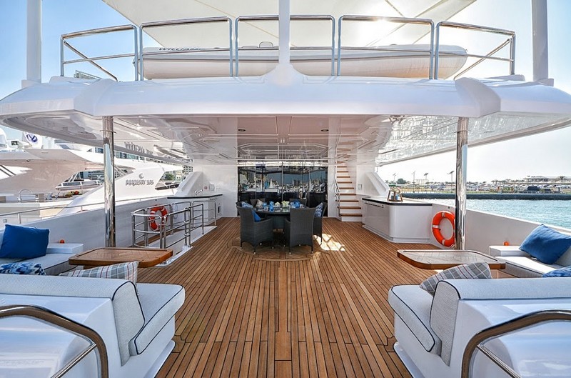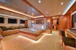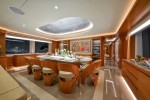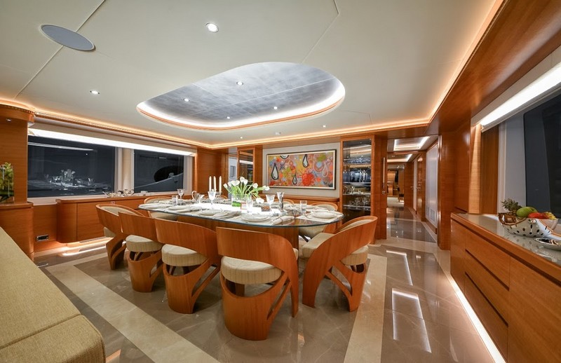 The Owner’s Stateroom, situated on the upper-deck, is discretely positioned away from the other guest staterooms, offering a grand ocean view, and is fully fitted with everything the owner might need, including a private en suite and Jacuzzi. The remaining four staterooms are intelligently distributed throughout the superyacht, including a VIP en suite stateroom, and double and twin guest staterooms. A formal indoor dining room for 12 guests, an extensive covered exterior dining area, and a luxurious fly-bridge equipped with a Jacuzzi, teppanyaki grill, piano lounge, and a fully equipped bar, offer endless possibilities for entertainment.