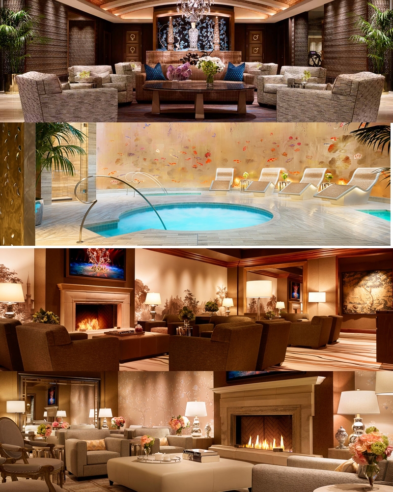 Other focal points include a hammered bronze and clear quartzite chandelier by famed French designer Hervé Van der Straeten; three oversized vases with intricate hand-laid mosaics fashioned from thousands of seashells by artist Thomas Boog; and two enveloping 18-by-90-foot murals in the hydrotherapy areas featuring soothing koi fish from artist Paul Montgomery.