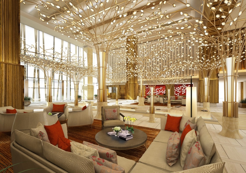A magnificent lobby will welcome guests on arrival with a forest of lights leading to the beach front. Fourteen bronze metal trees standing seven, eight and nine metres high – each with 900 lights – create a canopy of crystal and light that glisten and sparkle, just like the nearby ocean. The expansive space opens up onto an outdoor area comprising water features, walkways, stone bridges and teak decks creating a path to the shoreline.