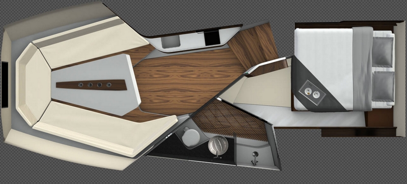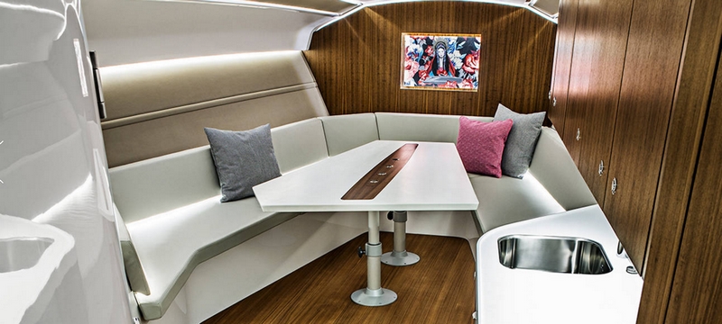 The 1414 Demon provides lots of living space: a relaxing lounge atmosphere with a large bathing plattform and a well garnished outdoor bar meet a uniquely designed interior with enough headroom, a spacious bathroom, a kitchenette, a large sitting area and a sleeping accommodation for up to four people.