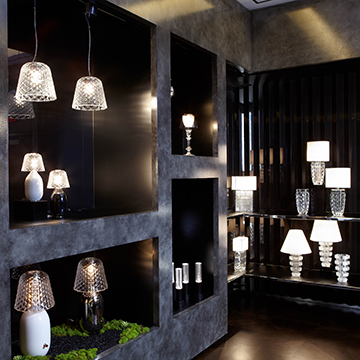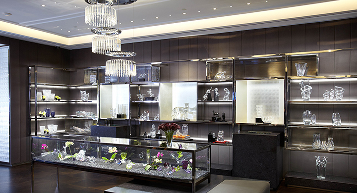 The space’s most dramatic feature is the Icon Wall. Made of Nordic black granite, the wall displays large-scale product in an eye catching fashion across its two-story surface. The entryway, as well as the Jewelry Bar, feature video panels, which connect Baccarat’s expansive 250-year history with the future, bringing to life Baccarat’s storied past of artisanship and luxury.