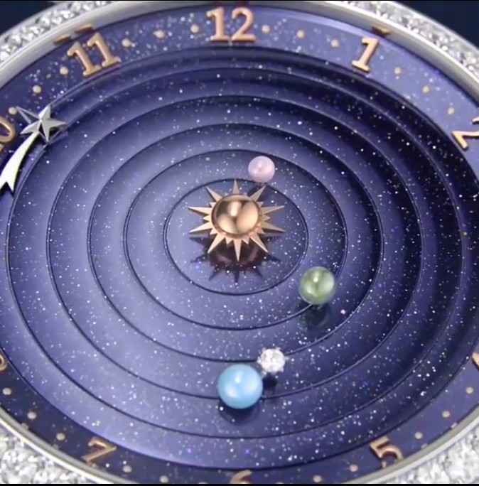 Discover the world’s most prestigious gatherings & exhibitionsPlanets of differing volumes rotate around a Sun made of pinkgold, gleaming in the center of the dial. A pink mother-of-pearl Mercury and a turquoise Earth were meticulously hand cut in spherical shapes, while Venus is portrayed with a green enamel bead, fashioned in the Van Cleef & Arpels enamel workshops in Meyrin, Switzerland. The familiar glow of the Moon as it orbits the Earth comes to life with a brilliant- cut diamond, contrasting with the midnight blue background.