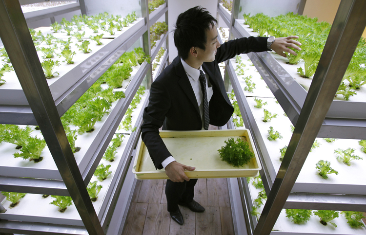 An employee harvests vegetables grown under Hybrid Electrode Fluroescent Lamps (HEFL) inside an office of Pasona Group, an employment and staffing company, during a photo opportunity in Tokyo October 20, 2010. Vegetables, fruits and rice are grown and harvested by the employees at the company’s “urban farm”, aimed at creating a working environment coexisting with nature, according to the company. Negotiators from over 190 countries are gathered in Nagoya, Japan for a United Nations meeting to discuss ways to fight rising extinctions of plants and animals from pollution, climate change and habitat loss. REUTERS/Yuriko Nakao (JAPAN – Tags: ENVIRONMENT AGRICULTURE FOOD BUSINESS) – RTXTMQS