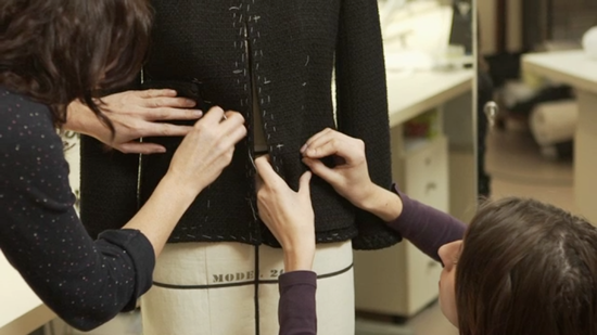 Produces with the most meticulous care for the smallest detail, the little black jacket takes shape through numerous stages that begin with an initial sketch, followed by draping, cutting, assembling, and the position of the label, the trimming, the buttons and the chain.
