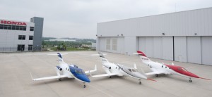 The third FAA-conforming HondaJet (right) debuts in brilliant HondaJet Red Pearl Metallic. This aircraft will join the first FAA-conforming HondaJet (center) in flight testing this summer. Also pictured is the original proof-of-concept HondaJet.