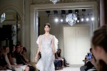 The design for New York is much more architectural, with a nod to the 1950s. The gown features a cathedral train with 3D-threadwork embroidery and crystal and pearl beading over silk duchess satin.