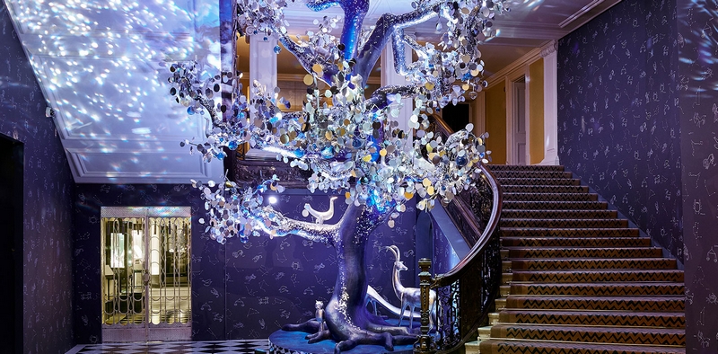 For its annual tradition, Claridge’s Hotel London has invited a distinguished designer to reinterpret the annual Christmas tree in their own distinctive style. For 2018 Christmas, American designer Diane von Furstenberg created a spectacular Tree of Love featuring over 8,000 hand painted silver-leafed leaves, glass spheres and 150 hand-blown glass hearts. The Tree of Love plays host to six different silver-leafed abstract designed animals.