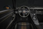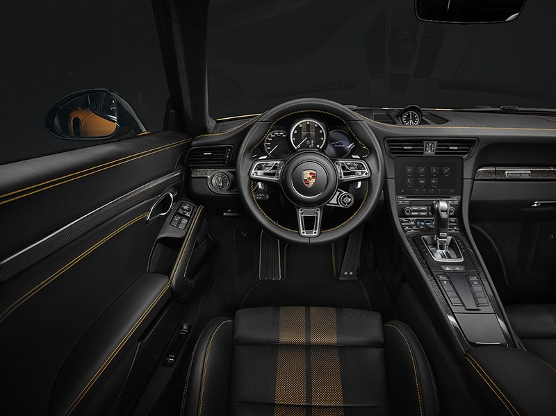 What makes the Porsche 911 Turbo S Exclusive Series Coupe so distinctive is the exclusive Golden Yellow Metallic paint finish and various carbon fiber components, including the front trunk lid, roof, and side skirts. The 18-way adjustable sports seats are covered in perforated leather. The inside layer has two stripes in Golden Yellow, creating a unique effect. The seams and the Turbo S lettering stitched into the headrests are also finished in Golden Yellow, and the roof lining is made of Alcantara with a Golden Yellow double-stripe look. Fine copper thread is integrated into the trim strips of the carbon fiber interior package. The plate featuring the limited-edition number on the passenger’s side underlines the car’s exclusivity. The door sill guards, also finished in carbon fiber, include illuminated Exclusive Series lettering.