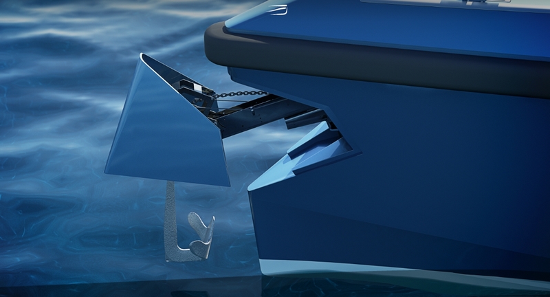A special Besenzoni anchoring system with an extending arm to simplify anchor operations, is hidden behind a flush-fitting hatch in the bow and can be operated at the touch of a button from the helm station. The pronounced trademark wraparound fender provides a practical docking solution instead of bulky fenders.