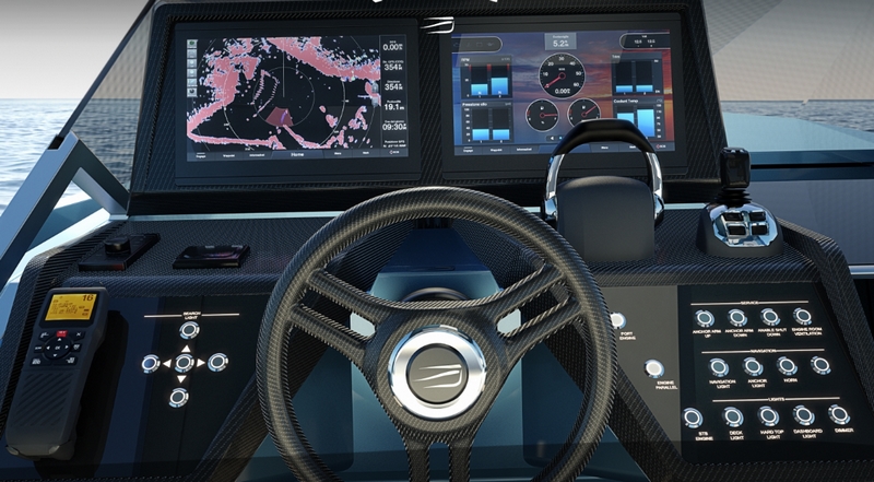 The standard propulsion package comprises the new Volvo IPS 650 engines (twin totalling 1020 hp) with user-friendly joystick controls for a top speed of 38 knots.