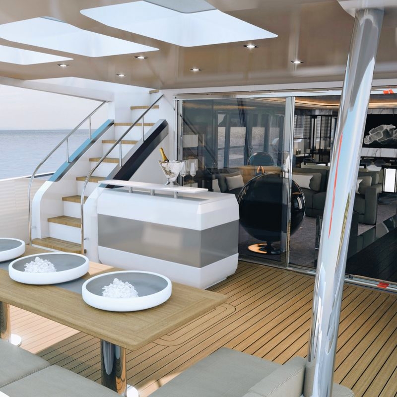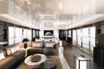 To the stern the jet ski and tender garage can be opened to reveal a surprising and convenient beach club complete with bar. A hydraulically operated bathing platform and fold down buttresses are the perfect place for sun loungers to relax close to the water’s edge. Teak decks and a hydraulic passerelle contribute to the yacht’s feeling of outstanding quality.
