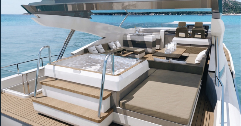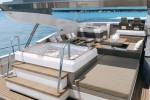 Exterior space is made up of a large area aft of the saloon on the main deck, ideal for dining; the vast flybridge features a Jacuzzi, extensive social seating areas and a sun pad, wet-bar with sink, BBQ, fridge and ice maker offers convenience for smooth entertaining as well as an impressive external helm position.