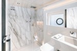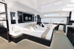 A unique feature is the floor to ceiling fully glazed automatic patio doors on three sides of the saloon which when open allow for an unrivalled connection to the outdoors. The Sie Matic galley, manufactured to the highest standards is complimented by Gaggenau appliances and has access from the side deck allowing for separate and discreet crew access.