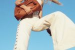 Gigi Hadid leaps for the stars in the Spring-Summer 2023 campaign shot by Zoë Ghertner on location at the Pisgah Crater in California. Gigi wears the cropped halter top in off-white wash recycled cotton hemp Chloé denim and matching wide-leg ‘rave’ trousers. Both designs are embellished with metallic eyelets inspired by isotopes. She carries the new Penelope bag, which makes its debut this season, under her arm.