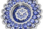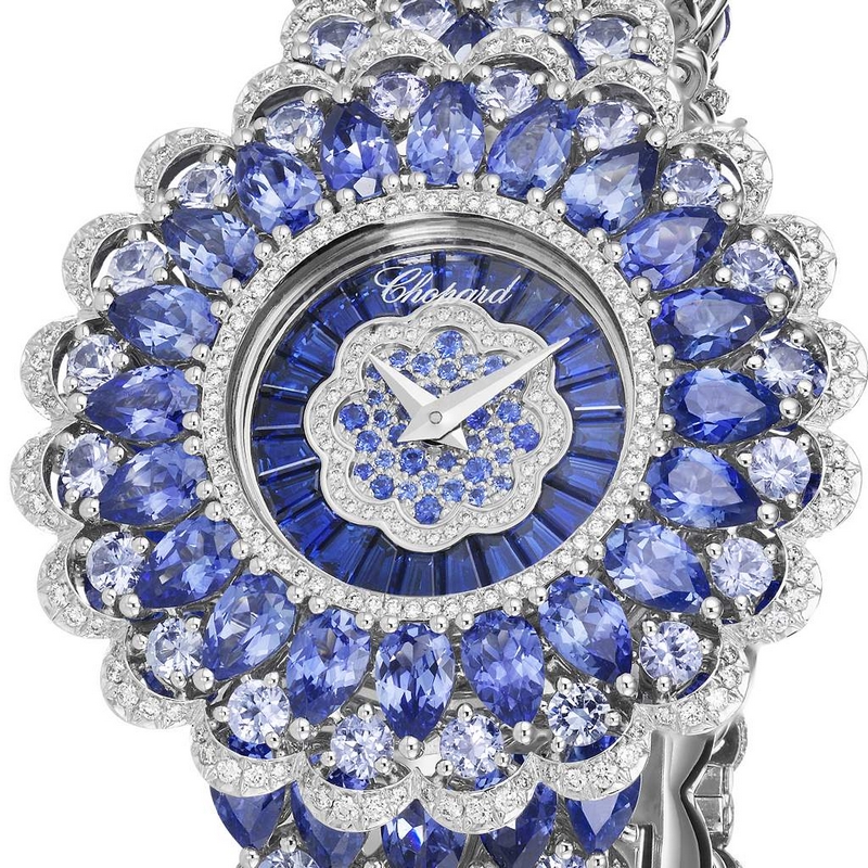 The spectacular watch is set with pear-cut blue sapphires, brilliant-cut pastel sapphires and white diamonds, composing a subtle and airy lacework pattern. On the dial, baguette-cut sapphires surround a dainty corolla.