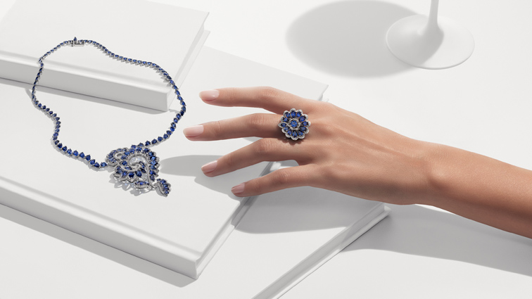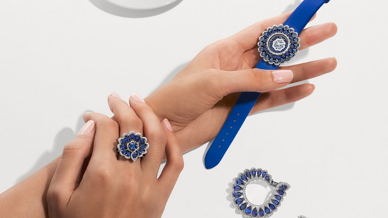 Discover the world’s most prestigious gatherings & exhibitionsThe watch bracelet picks up this ornamental jewellery lacework theme and the model is also available with a satin strap. The earrings and the ring are graced with the same delicate curves, finely adorned with a lacy pattern of pear-cut sapphires and hemmed with diamonds, while the ring is crowned by a brilliant-cut central blue sapphire.