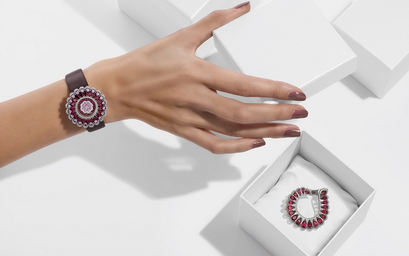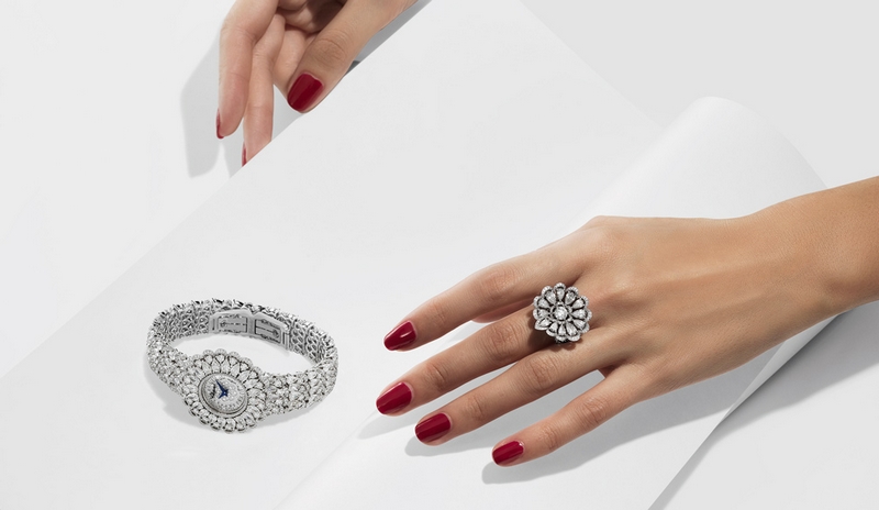 The watches are set with pear-shaped and brilliant-cut diamonds, sapphires, emeralds and rubies. On their dials, matching baguette-cut gems surround a dainty corolla evoking a floral motif using the snow-setting technique. The models are fitted with bracelets extending this jewellery lacework