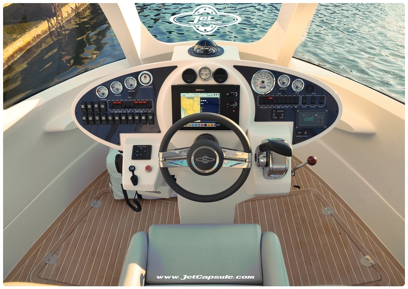 The Private Jet Capsule options include twin engines +electric, dual idrojet propulsion, rear semi/automatic sliding doors, photochromic windows, sunroof, toilet/services room, pilot cabin, private jet armchairs, air conditioner. These are just some details of the first 25ft Private Jet.