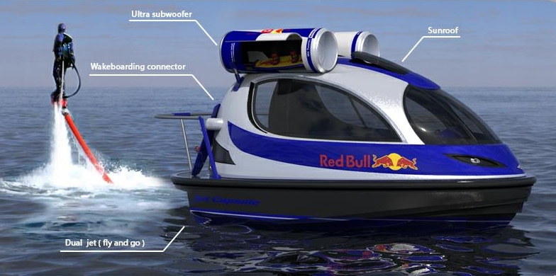 There is also a Party Version with two big soobwoofers located on the top of the roof which allows the transport of different water sport facilities. Thanks to dual jet pumps, the pilot can use the fly board and pilot the Jet Caspule at the same time.
