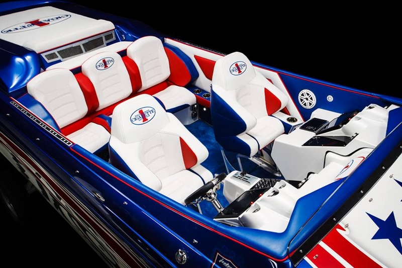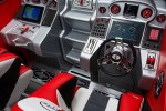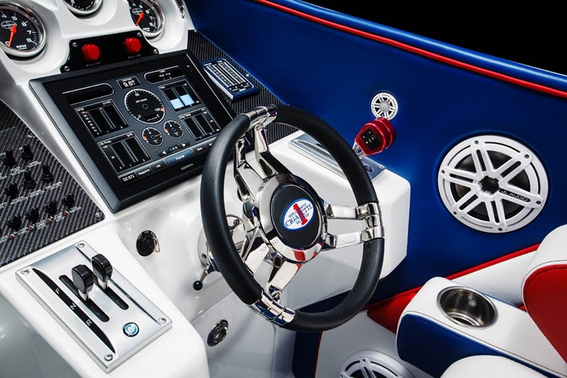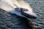 The cockpit was moved back, extending the deck to coincide with the latest Mercury Racing powerplants-the 1350 HP QC4v with M8 drives. The hull and deck lines are smoothed for improved aerodynamics and the hatch has been completely redesigned to optimize the airflow to the high- horse powered, dual turbocharged Mercury Racing engines.