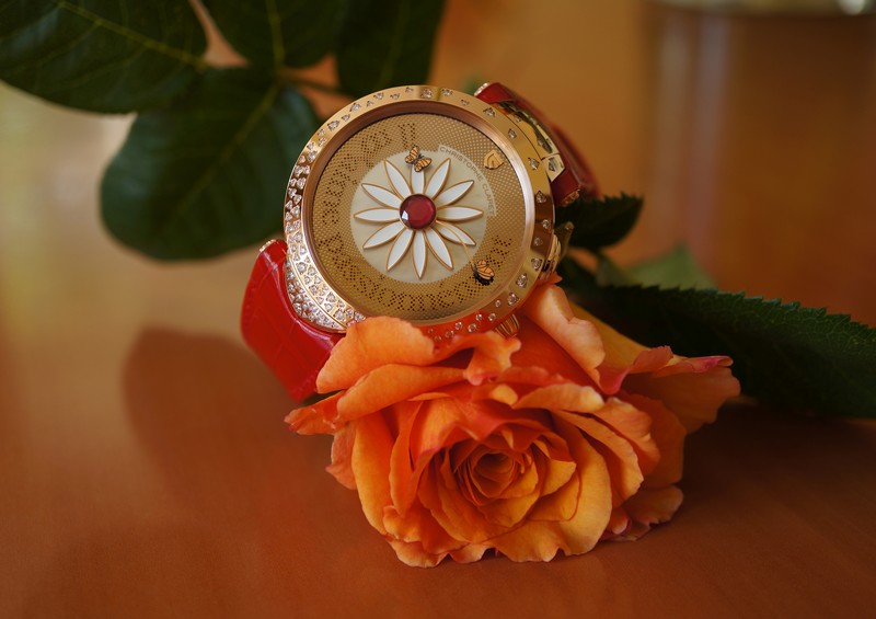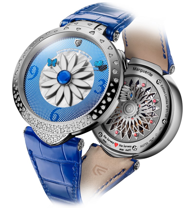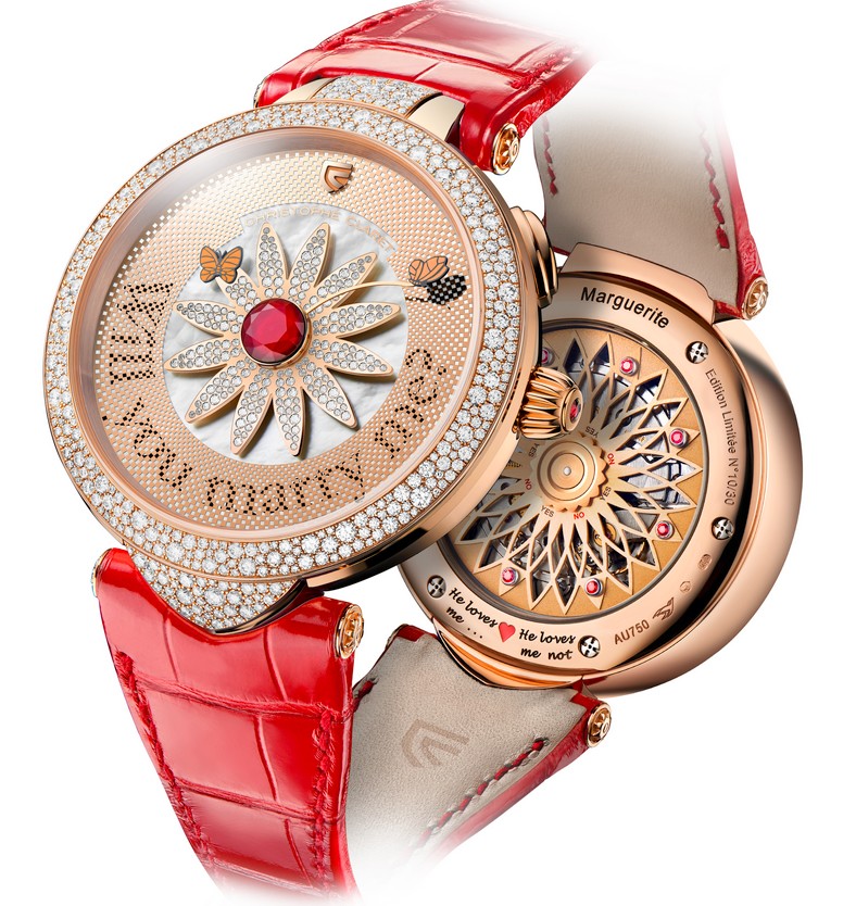 The ultimate romantic watch, Marguerite turns lovingpassion into the stuff of intimate daydreams. In addition to the Arabic numerals at 3, 6 and 9 o’clock,the dial presents a second display. One press on the pusher at 2 o’clock makes the numbers disappear to reveal the phrase: “Il m’aime passionnément” (He loves mepassionately). This message can be personalized via a configurator on the brand website. The watch can display any messagerequested by the owner, in the desired language, with a limited number of characters.