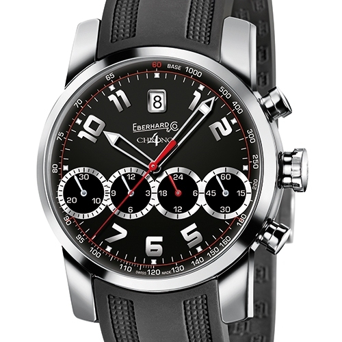 Featuring its iconic counters lined up along the same horizontal axis, an exclusive feature of Eberhard & Co, the famous Chrono 4 adopts an even sportier look this year in its original 40 mm steel case. The black counters creating a tone-on- tone effect with the dial are lit up by contrasting silver-toned rings echoed by the Arabic numerals that stand out against the hollowed luminescent studs. The chronograph sweep seconds hand lends a very dynamic touch of red also featured on the 24-hour counter hand.