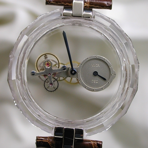 entirely mechanical and hand-crafted timepiece displays the hours and minutes. Other models issued in small limited series or as one-of-a-kind creations may be fitted with striking mechanisms or other additional complications on request.