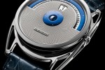 HYT continues its quest for hybridisation, this time with a blue liquid that interacts with the mechanical movement through an interface of two bellows in a “V” arrangement. The central minute hand has a layered construction to run alongside the fluid system and sweep the bellows by making a jump after 30 minutes. The crown-position indicator (“H-N-R”) at 3 o’clock is balanced by another hand corresponding to a temperature indicator. This exclusive HYT innovation tells the