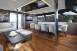 Sailing should bring plenty of excitement, with a generous sailplan that includes a 100 square metre mainsail, a 58 square metre jib and a giant 145 square metre Code Zero for reaching. Little wonder the boat achieved better than 10 knots during sea trials. A stylish bowsprit offers plenty of downwind sailing options, while windward performance gets a boost from the swinging centreboards in each hull. Twin wheels are located at the forward end of the flybridge, and there is a full navigation station in the saloon below.