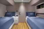 Accommodation runs to two large double cabins and two twins for eight guests, and a further three berths for crew. Tumer Design has created an interior that feels modern and minimal, with a neutral palette of darker colours blended with colourful blue and orange patterned fabrics. Atmospheric lighting allows you to switch from a calm, relaxed vibe into evening entertainment mode, with social spaces inside and out. Naturally, there’s a large electrically-controlled bathing platform aft which carries the 3.5m tender.